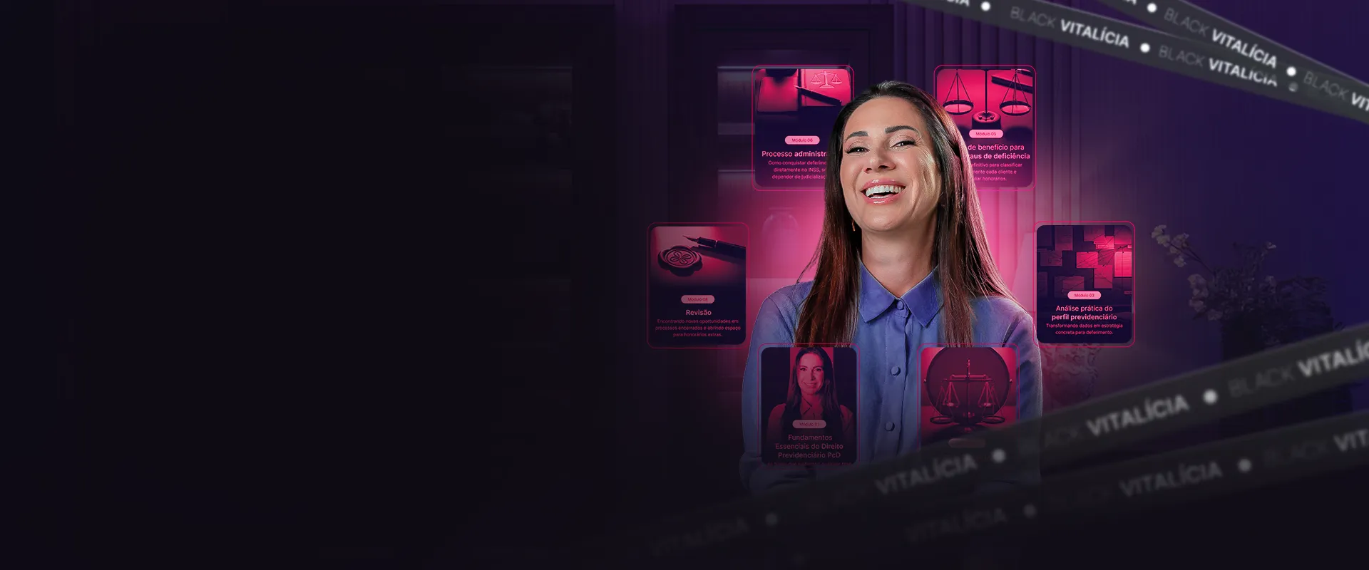 Com a Black Vitalícia PcD, minha missão se amplia: compartilhar a experiência de mais de 20 anos para que advogados previdenciaristas conquistem autoridade, se posicionem como referência em aposentadorias PcD e multipliquem seu faturamento nesse mercado que cresce a cada dia.